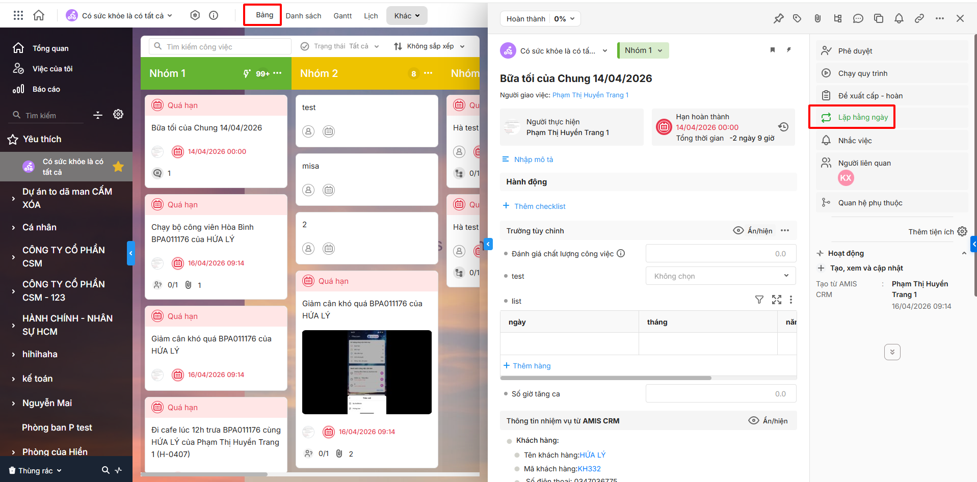 Bước 1: Tại giao diện công việc dạng Bảng, chọn chi tiết công việc cần bỏ lặp lại.