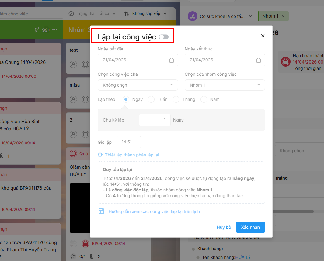 Bước 2: Tại mục Lặp hàng ngày, trên giao diện Lặp lại công việc, ấn tắt lặp lại.