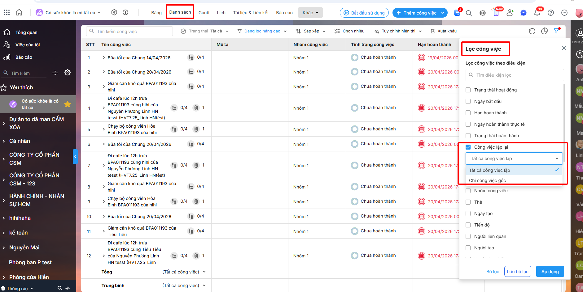 2.2. Lọc công việc ở dạng Danh sách để bỏ lặp lại