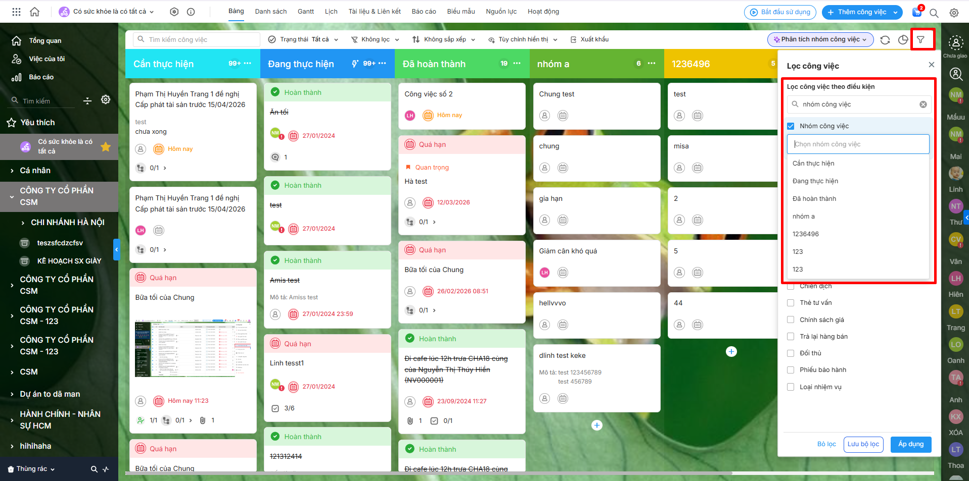 - Hướng dẫn thực hiện lọc theo nhóm công việc trong dự án