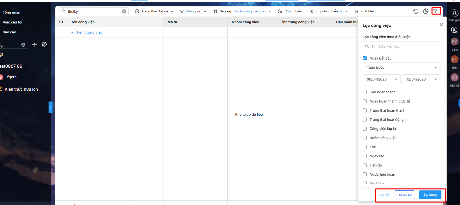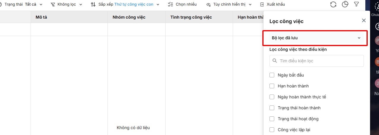 Bước 1: Trên giao diện của công việc\ chọn tới biểu tượng lọc ![]()