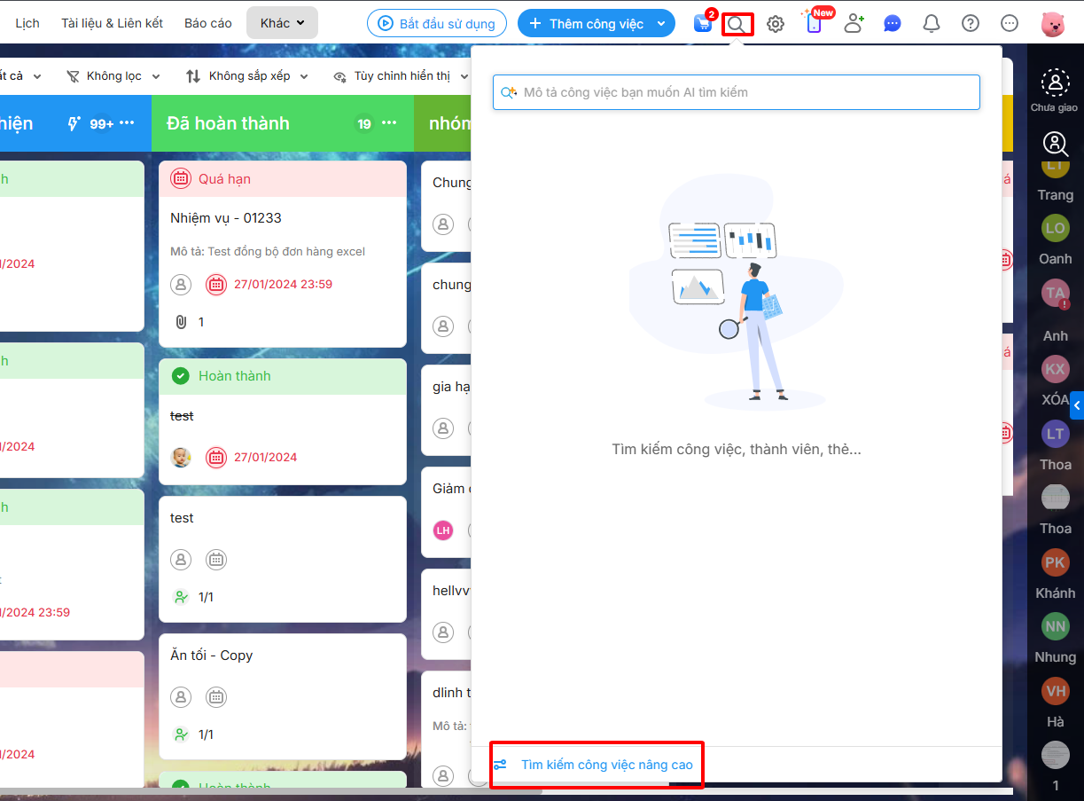 ở cuối các tiêu chí Người thực hiện/Người tạo/Người liên quan để chọn từng người hoặc chọn đồng thời tất cả những người trong đơn vị cơ cấu tổ chức công ty/phòng ban/dự án.