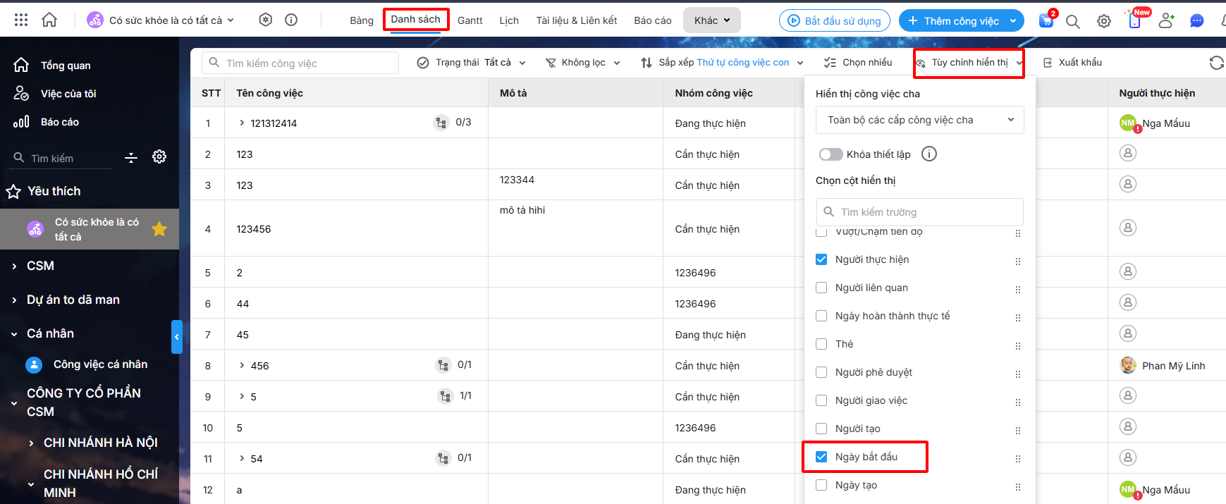 Bước 2: Tick chọn hiển thị cột Ngày bắt đầu