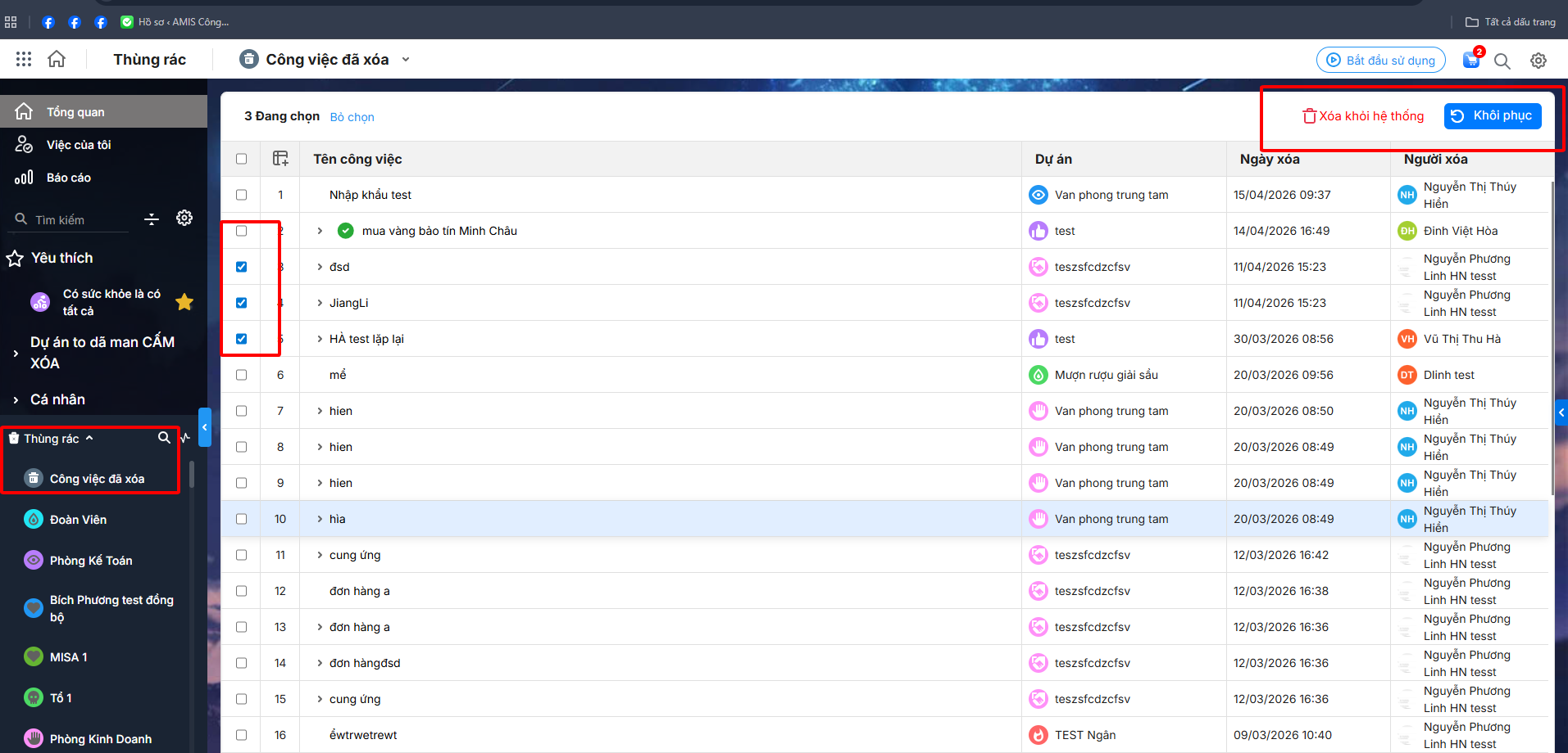 Bước 2: Tích chọn các dự án cần khôi phục\ chọn Khôi phục.