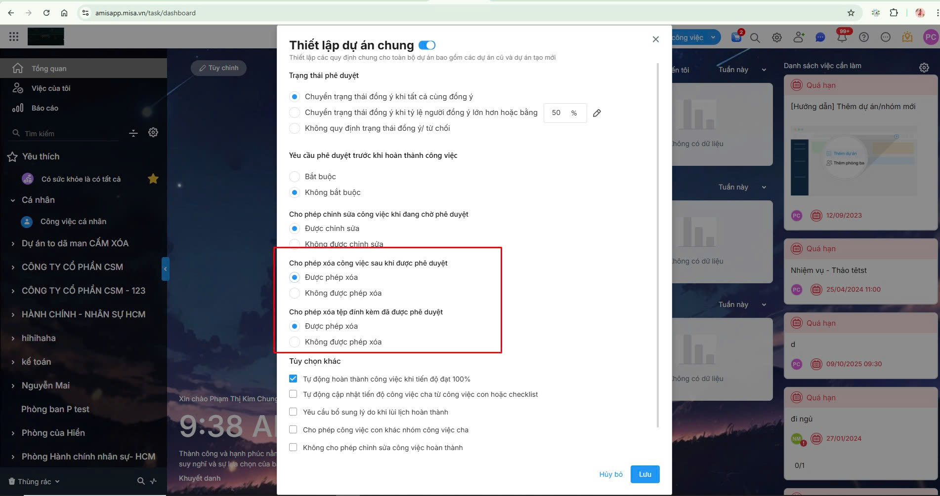 Bước 2: Thiết lập tích chọn Được phép/Không được phép xóa tại các mục Cho phép xóa công việc sau khi được phê duyệt/Cho phép xóa tệp đính kèm đã được phê duyệt.