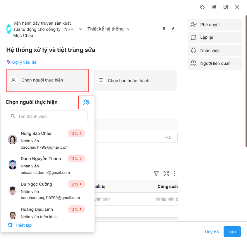 - Khi bỏ chọn người thực hiện, công việc tương ứng sẽ không được tạo mới cho người đó.