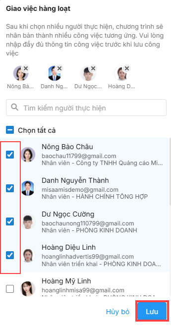 4. Tick chọn từng người muốn giao việc. Nếu chọn nhầm, nhấn icon dấu x để bỏ chọn người đó.