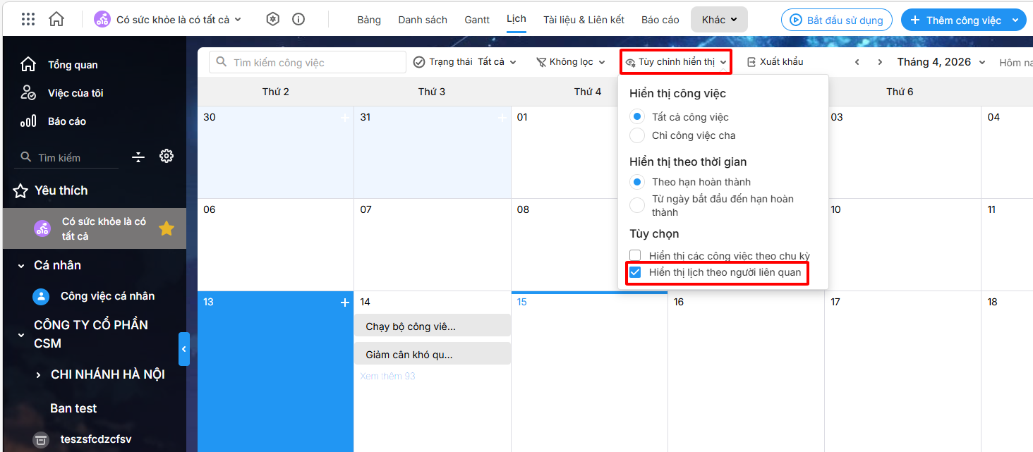 Trên giao diện dự án dạng Lịch\ vào Tùy chỉnh hiển thị\ Hiển thị lịch theo người liên quan.