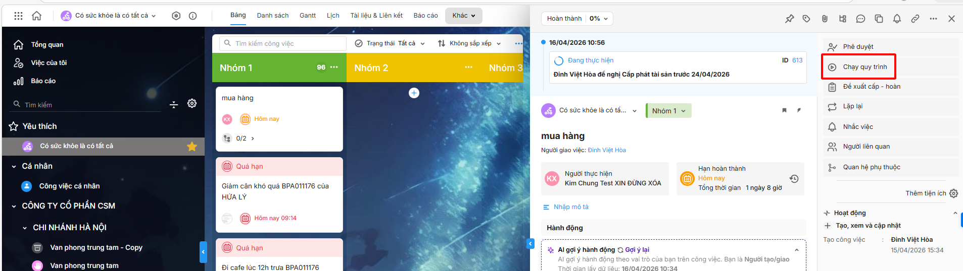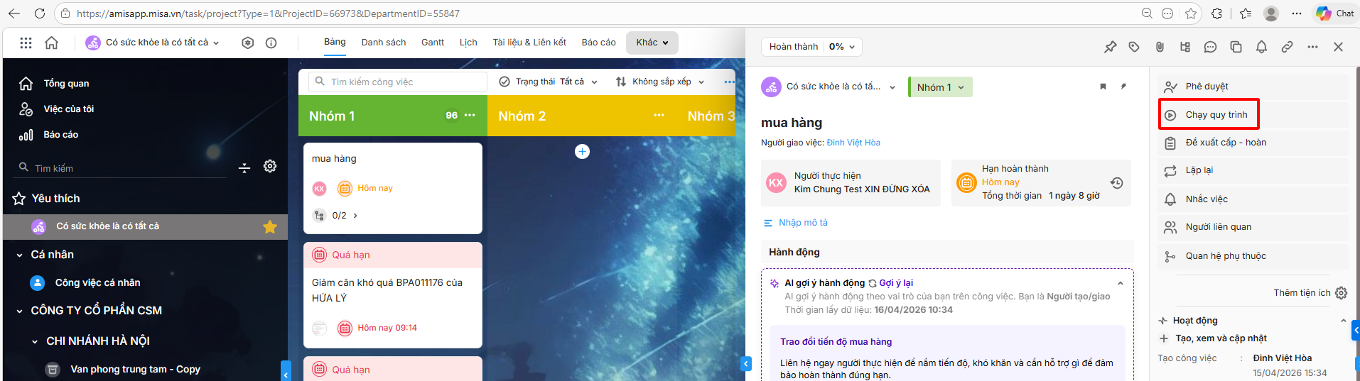 Bước 1: Trên giao diện AMIS Công việc, vào một dự án bất kỳ\ Chọn Chạy quy trình.