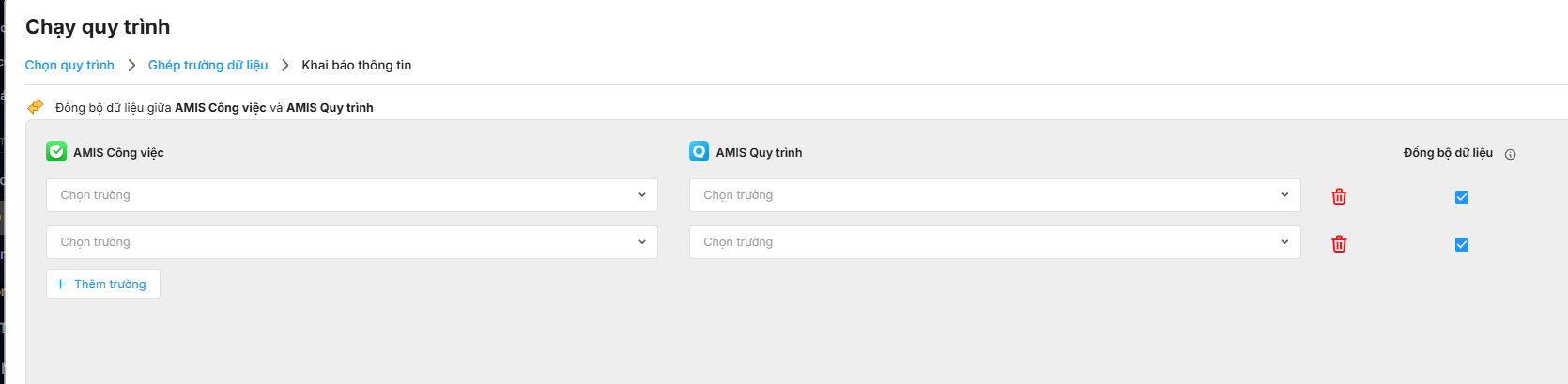 Bước 3: Ghép trường đồng bộ giữa hai ứng dụng để tự động trích xuất dữ liệu công việc lên lượt chạy: