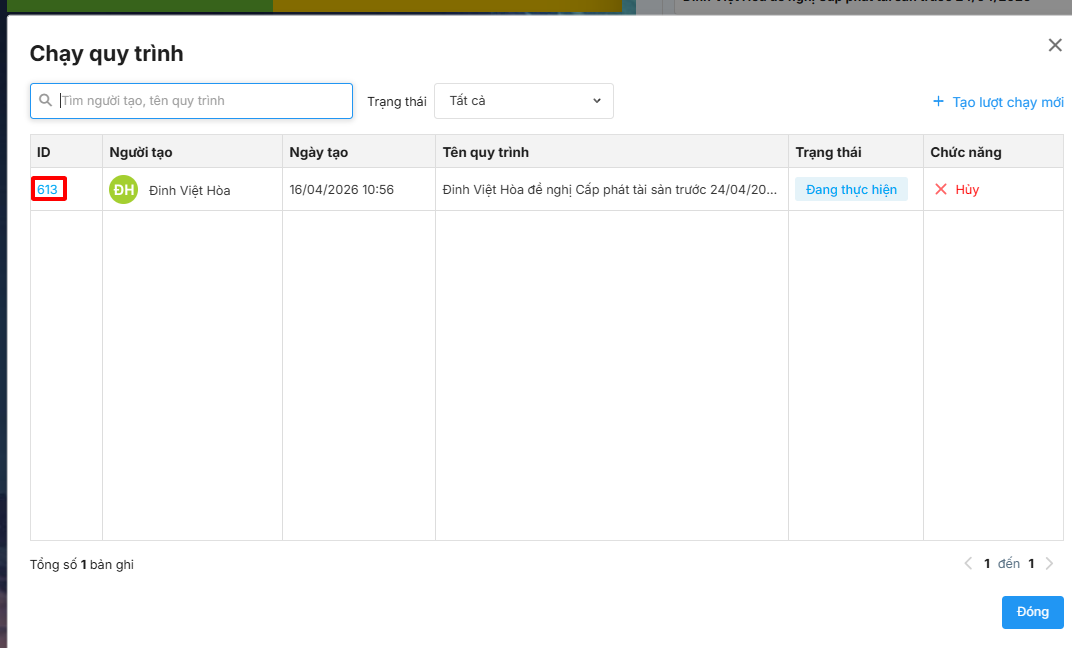 Bước 2: Nhấn vào ID để xem chi tiết lượt chạy trên AMIS Quy trình.