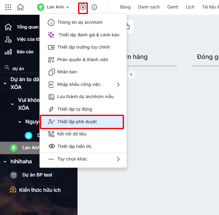 Bước 1: Trên giao diện dự án, chọn Thiết lập phê duyệt