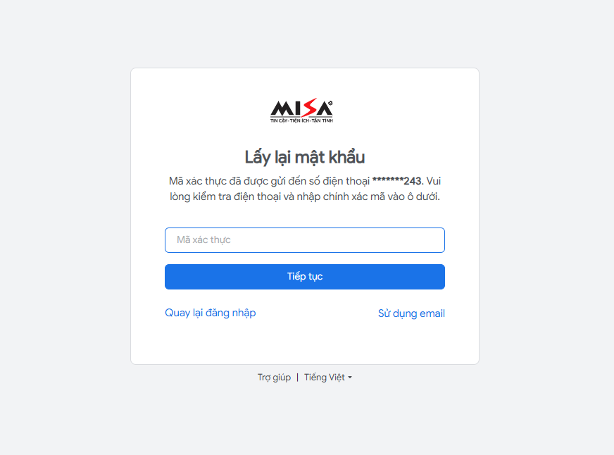 Bước 3: Nhập mã xác thực gửi về SĐT hoặc email