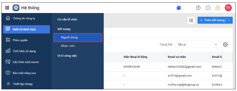 Bước 2: Chọn phân hệ Quản lý danh mục\Người dùng