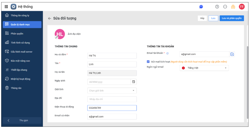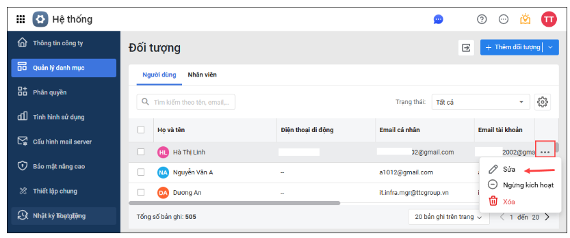 Trên giao diện Sửa đối tượng, cập nhật các thông tin Email.