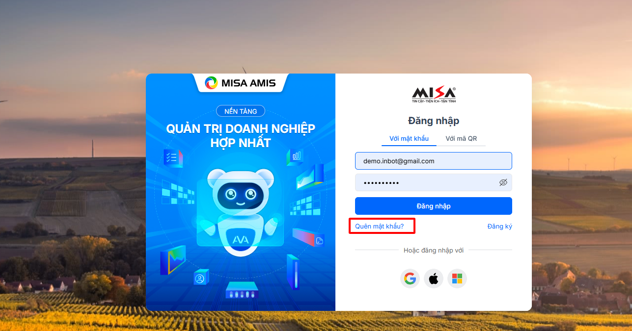 - Truy cập web https://amisapp.misa.vn/login và đăng nhập bằng tài khoản có quyền Quản trị hệ thống\ vào ứng dụng AMIS Hệ thống.