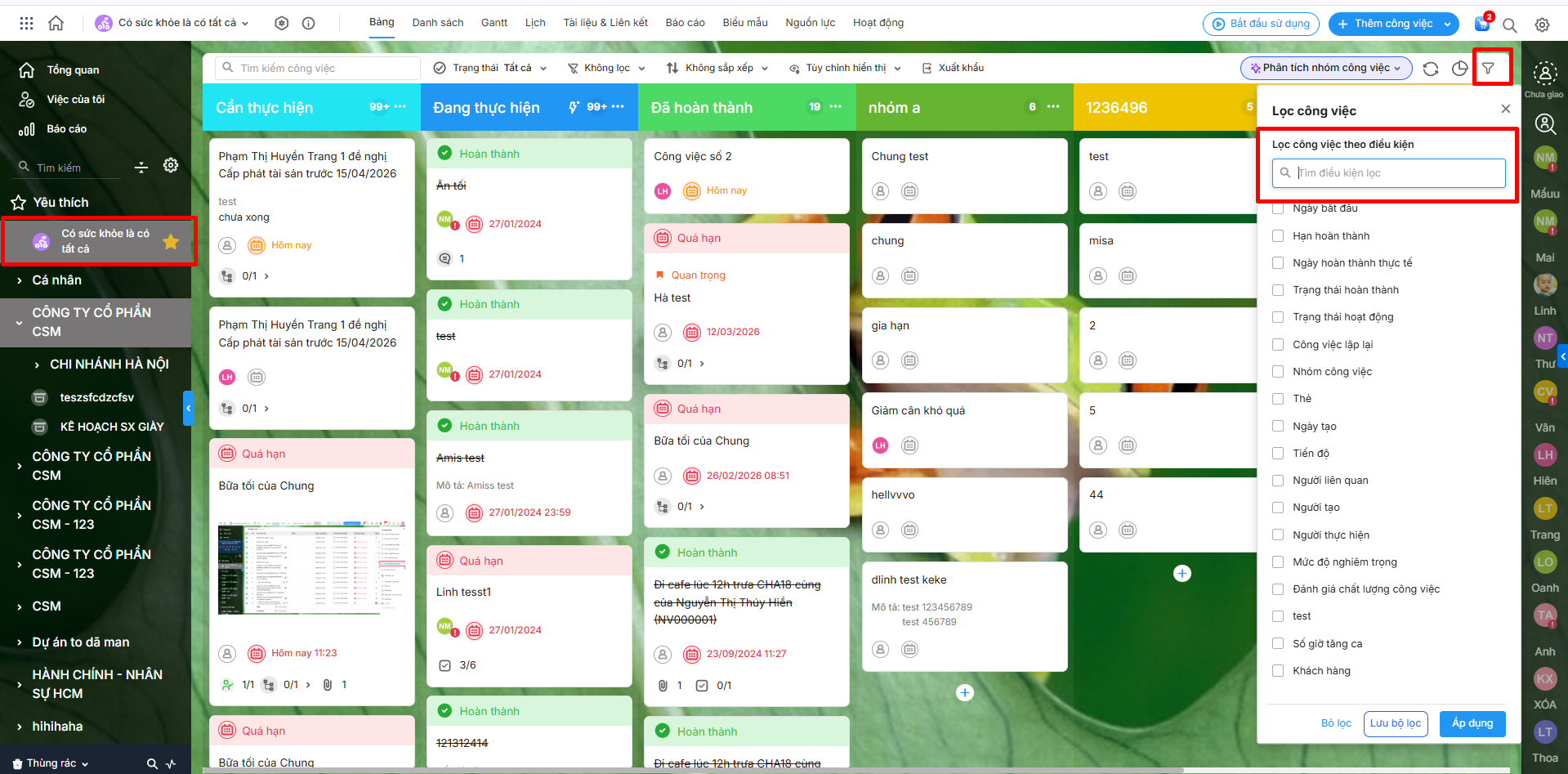 Trên giao diện dự án, tích vào biểu tượng , chọn trường tùy chỉnh muốn lọc giá trị.