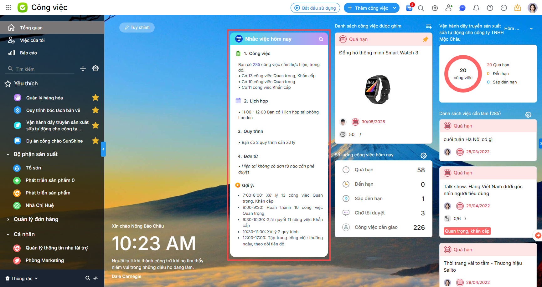 - Đọc nhanh số lượng từng hạng mục (Công việc, Lịch họp, Quy trình, Đơn từ) cần xử lý hôm nay.