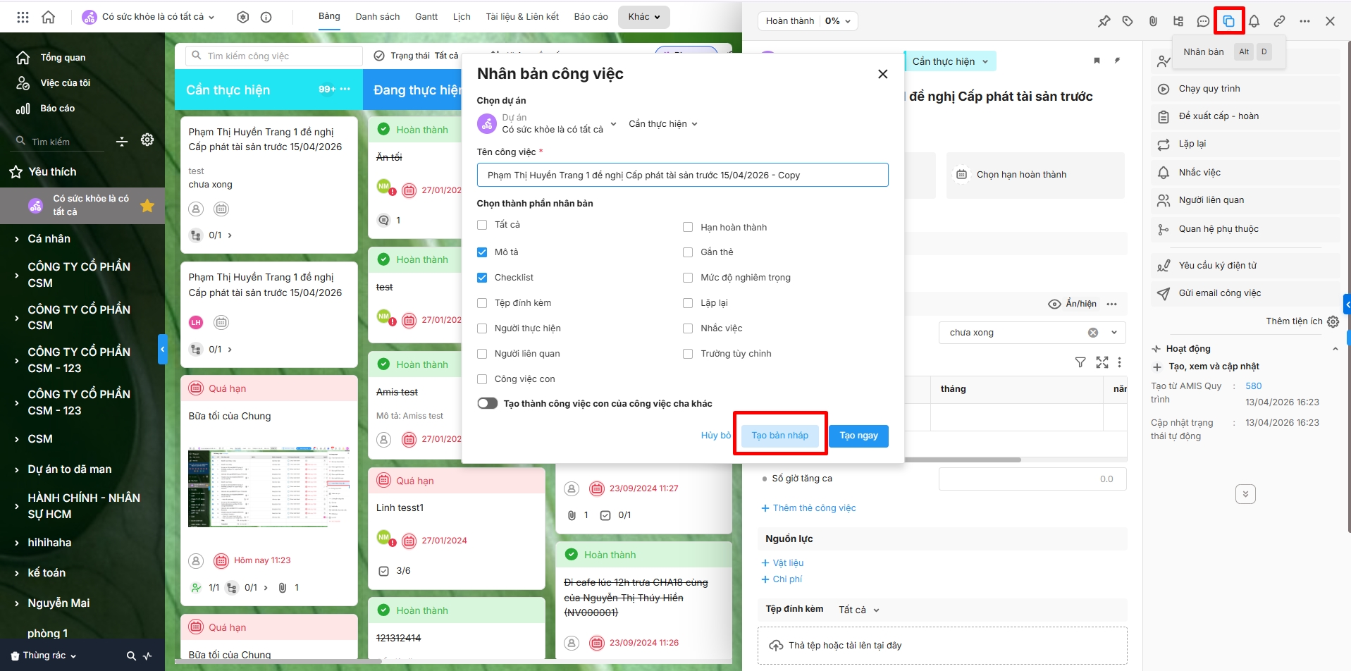 • Hướng dẫn thực hiện tạo bản nháp khi nhân bản công việc.