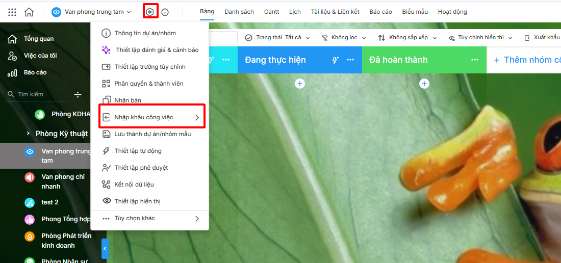 Bước 1: Vào biểu tượng bánh răng \  Nhập khẩu công việc tại giao diện dự án hoặc nhóm công việc.