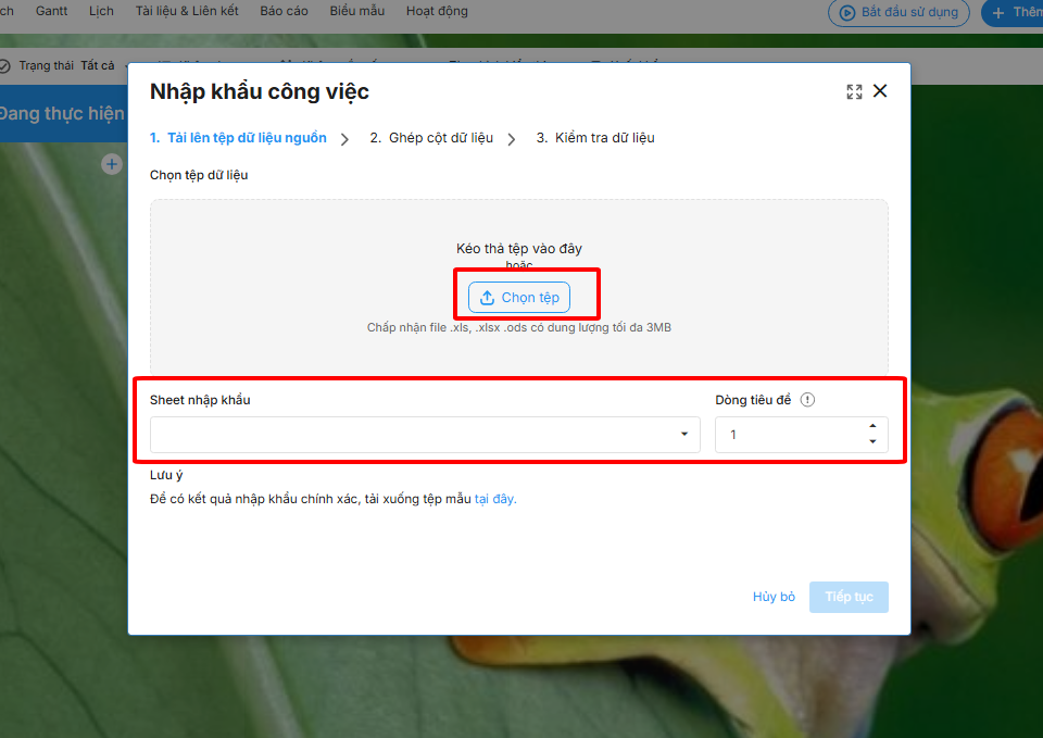 Bước 2: Tải lên tệp dữ liệu nguồn. Chọn tệp excel muốn nhập khẩu, lựa chọn Sheet nhập khẩuDòng tiêu đề. Nhấn Tiếp tục.