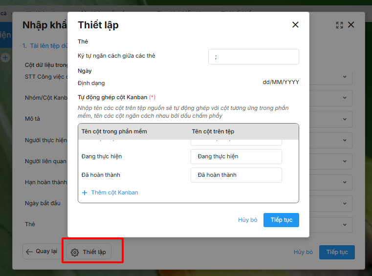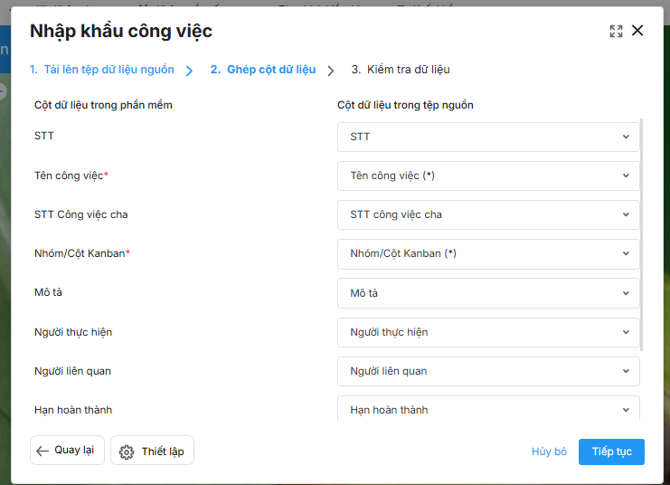 Bước 4: Thiết lập Cột dữ liệu trong phần mềm với Cột dữ liệu trong tệp nguồn xong nhấn Tiếp tục