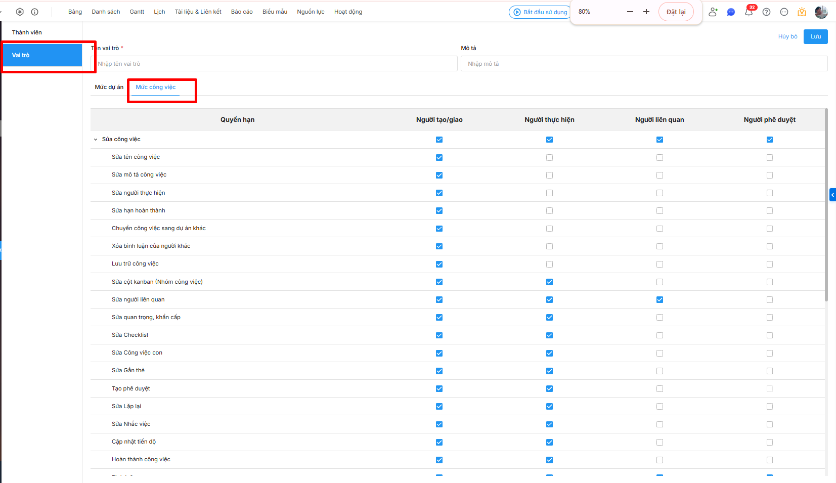- Phân quyền tại Mức dự án và Mức công việc: cần phân quyền nào cho vai trò thì tích chọn quyền đó