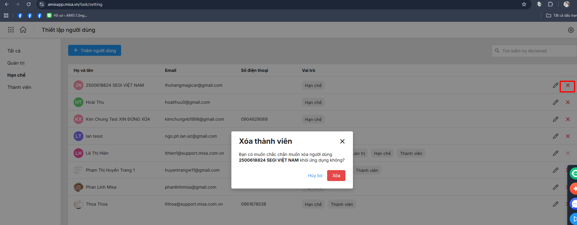Khi muốn xóa người dùng, chọn vào người cần xóa, bấm nút dấu X