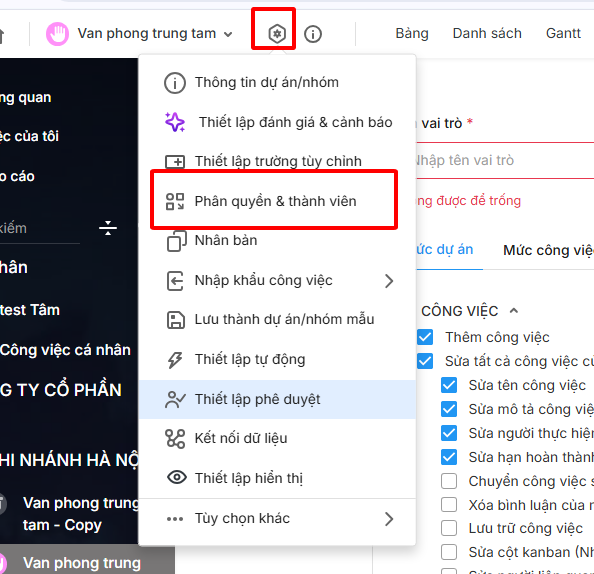 Bước 1: Truy cập vào Thiết lập dự ánPhân quyền và Thành viên.