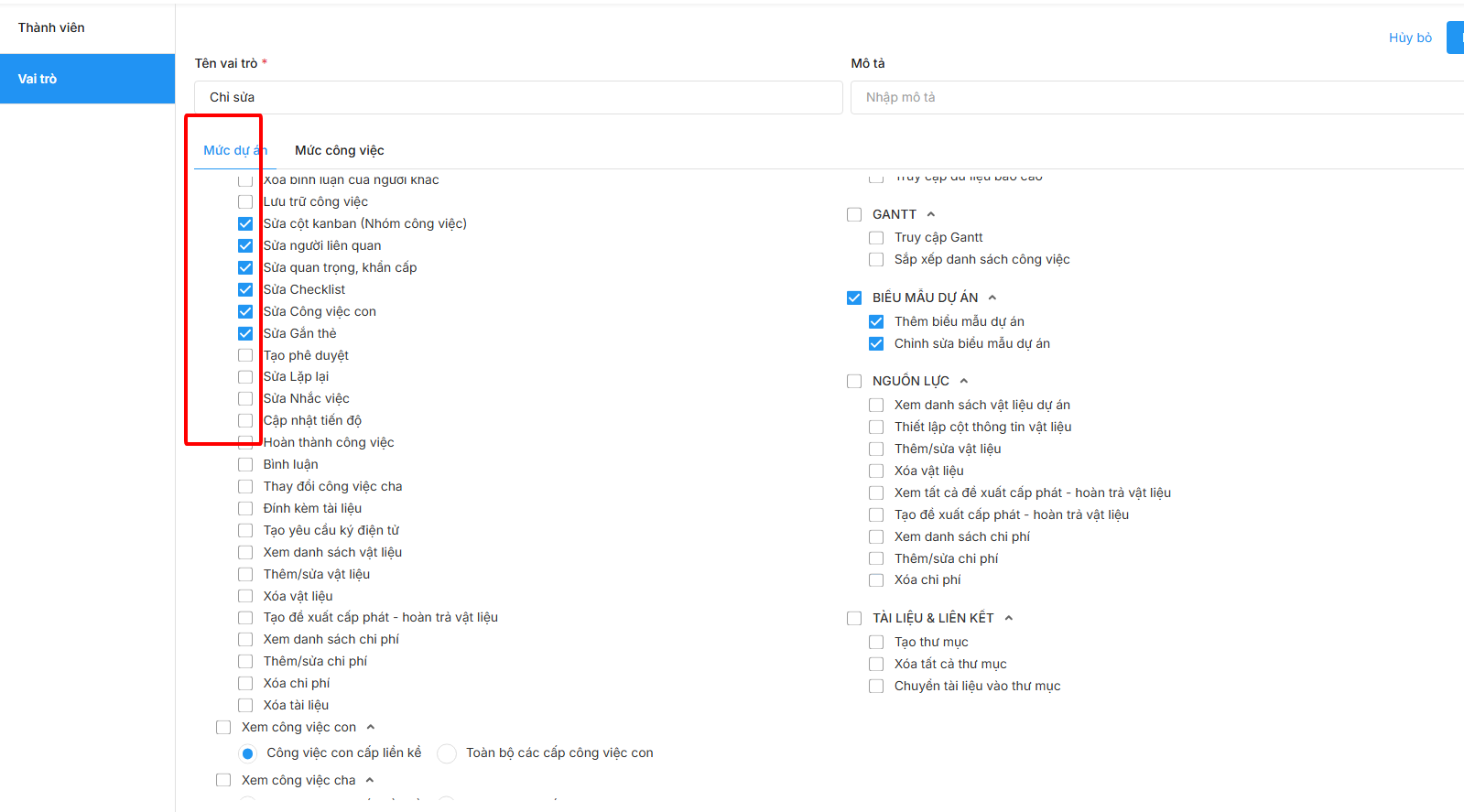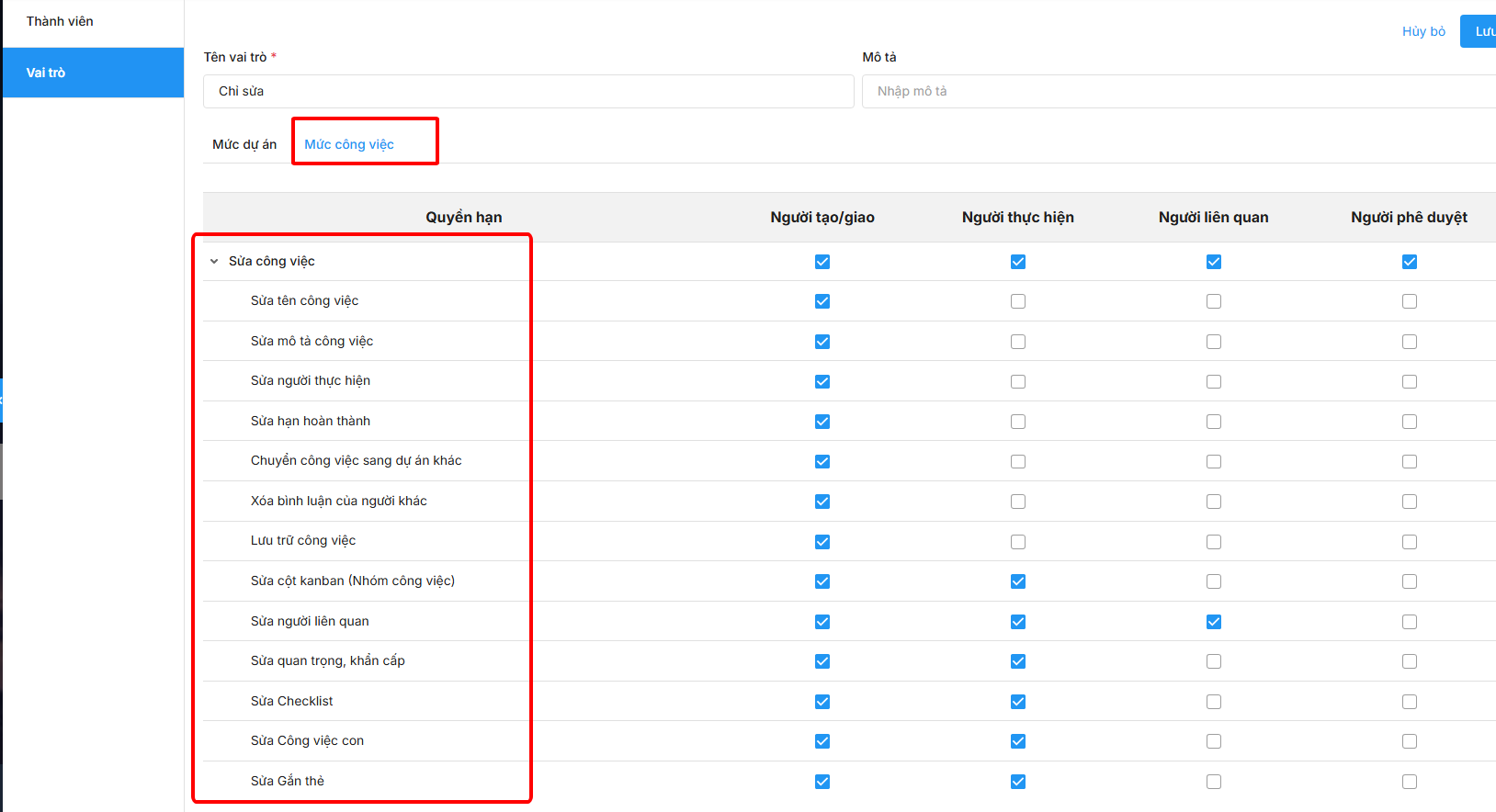 Bước 2: Trên bộ phân quyền của dự án đã tách riêng quyền sửa công việc và xóa công việc (Xóa công việc mình được giao, Xóa công việc của dự án/nhóm). Thiết lập các vai trò tại mức dự án và mức công việc.