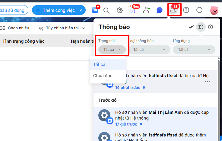 Bước 2: Tại mục Trạng thái\ chọn Chưa đọc để xem các thông báo chưa đọc