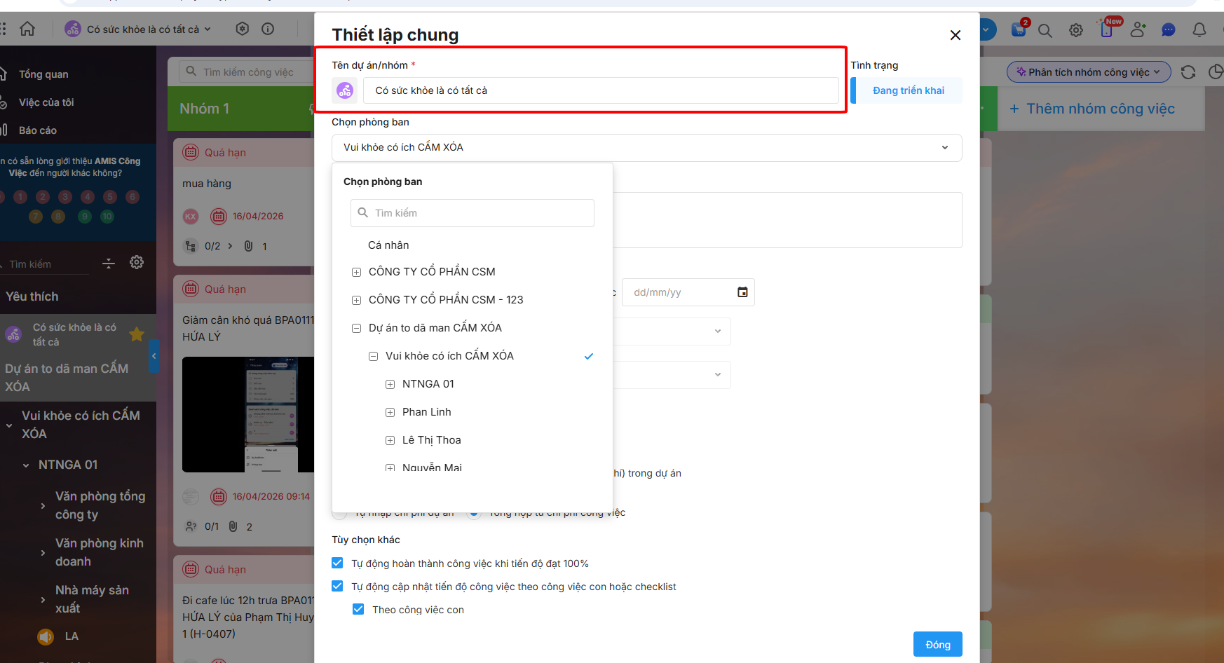 Bước 2: Tại giao diện Thiết lập chung\ sửa lại tên công việc tại Tên dự án/nhóm.
