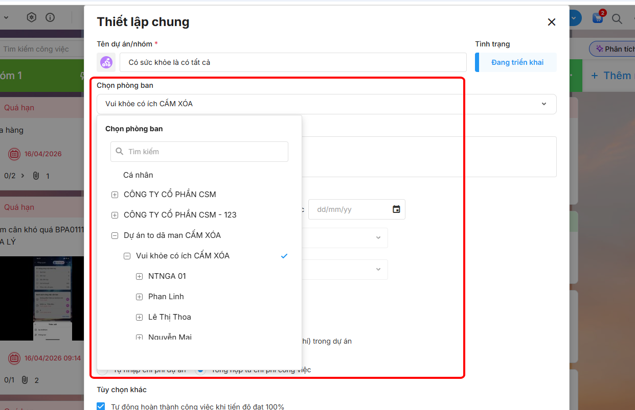 • Thay đổi phòng ban của dự án/nhóm.