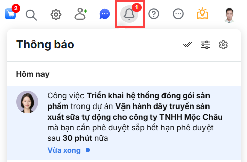 - Thông báo này sẽ hiển thị ở mục Thông báo quả chuông và email dưới tên nhóm thông báo “Khi có nhắc nhở phê duyệt công việc”.