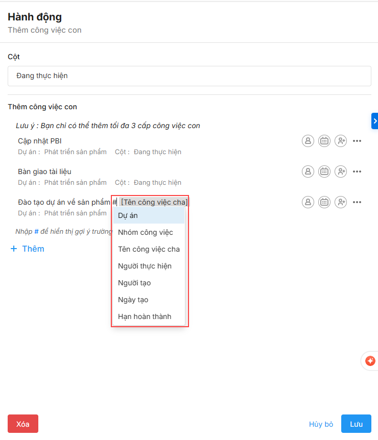 Tính năng Thiết lập tự động tạo công việc con cho phép anh/chị sử dụng các trường trộn để tự động tạo tên cho công việc con. Bằng cách chèn các trường thông tin động như [Tên công việc cha] và các dữ liệu khác vào tên, mỗi công việc con khi được sinh ra sẽ có một định danh riêng biệt và rõ ràng. Điều này giúp anh/chị dễ dàng phân biệt và nhận biết mối quan hệ giữa các công việc ngay trên danh sách mà không cần thao tác thủ công.