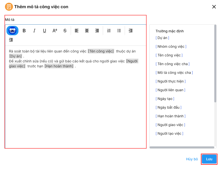 - Có thể chèn trường trộn bằng cách chọn các trường ở bên phải (ví dụ: Dự án, Nhóm công việc, Người thực hiện, Ngày bắt đầu, Trường tuỳ chỉnh,…). Khi chọn trường trộn, hệ thống tự động chèn trường này vào vị trí con trỏ trong phần mô tả.