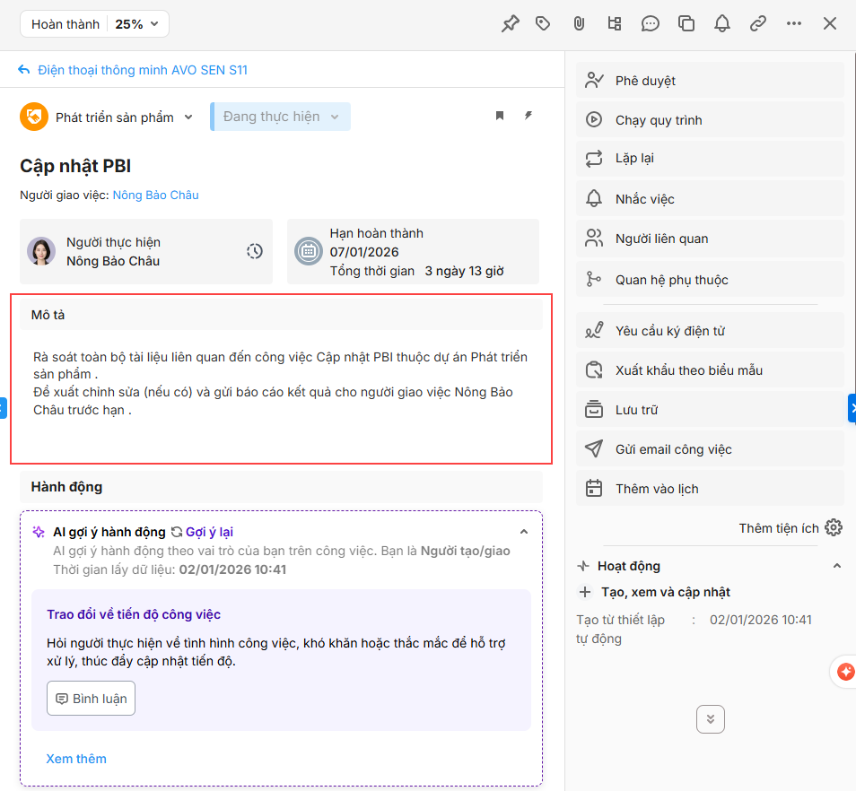 Tính năng tự động thêm mô tả cho công việc con cho phép anh/chị thiết lập nội dung mô tả mẫu khi tự động tạo công việc con trong quy trình quản lý dự án hoặc nhóm công việc. Tính năng này giúp đảm bảo mỗi công việc con được tạo đều có nội dung hướng dẫn, hạn chế việc phải nhập mô tả thủ công, tiết kiệm thời gian và hỗ trợ nhân viên mới tiếp cận nhanh nghiệp vụ.