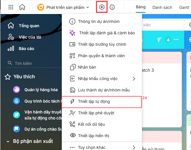 - Vào dự án/nhóm công việc cần bổ sung tự động công việc con.