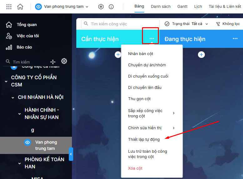 Bước 1: Trên giao diện quản lý công việc dạng Bảng của Dự án/Nhóm\ di chuột đến nhóm công việc cần thiết lập\ nhấn vào biểu tượng ba chấm