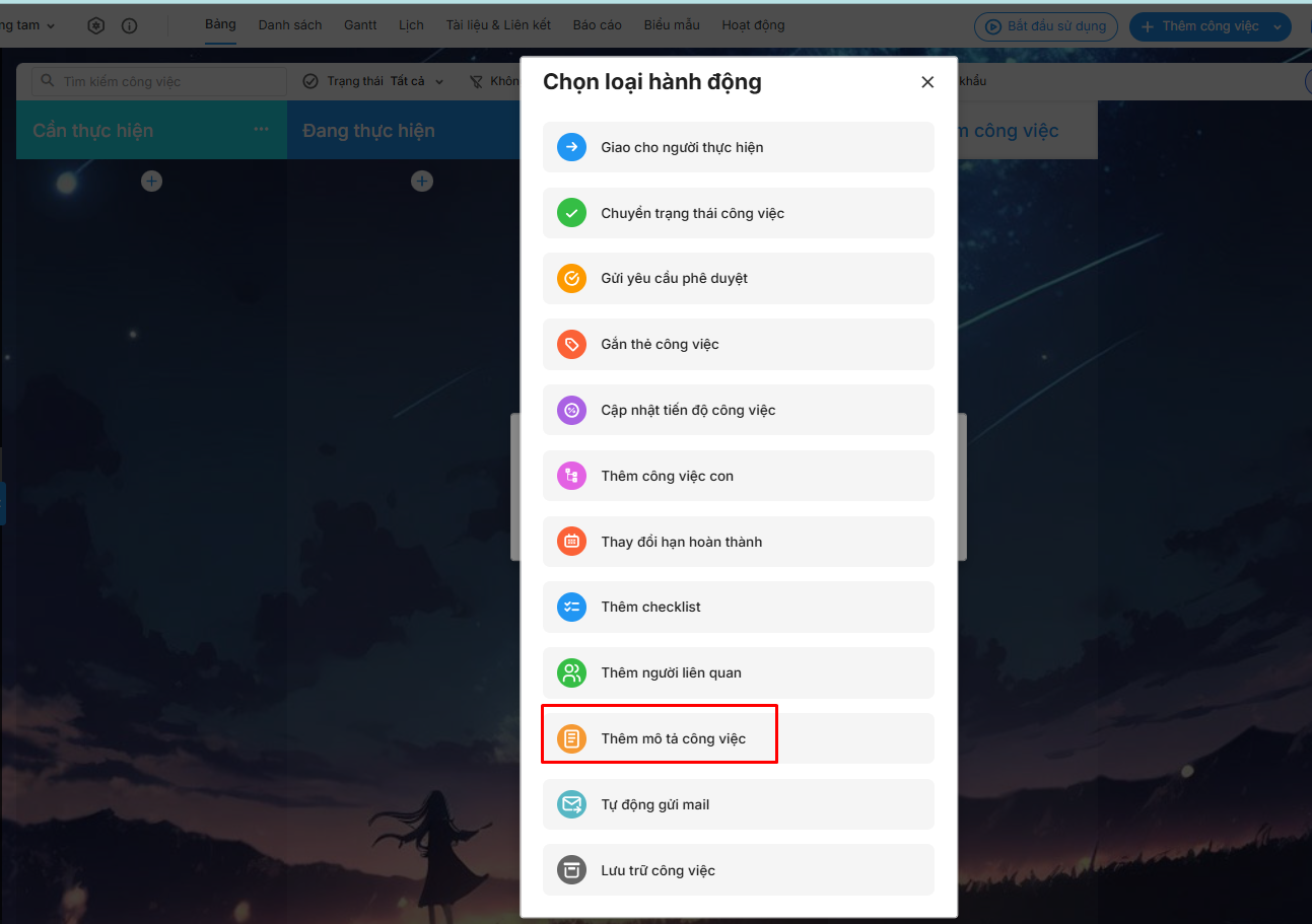 Bước 2: Nhấn Thêm\ chọn loại hành động Thêm mô tả công việc.