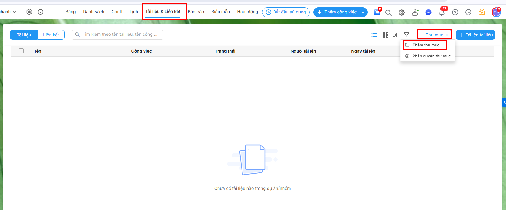 Thư mục tài liệu – Thêm mới, tải tệp, phân quyền quản lý tài liệu dự án