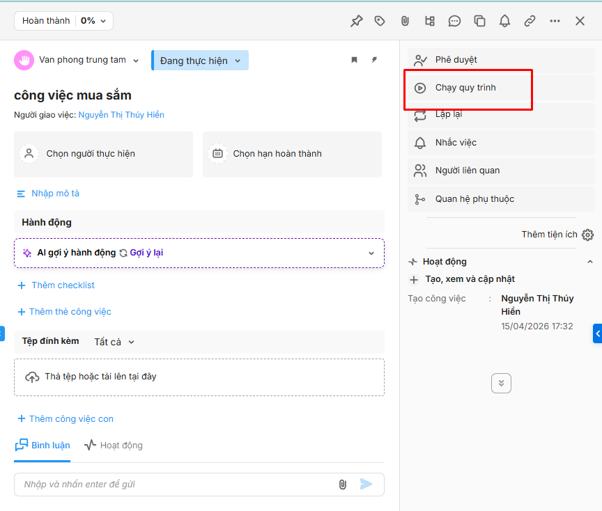 • Chạy quy trình ngay trên công việc