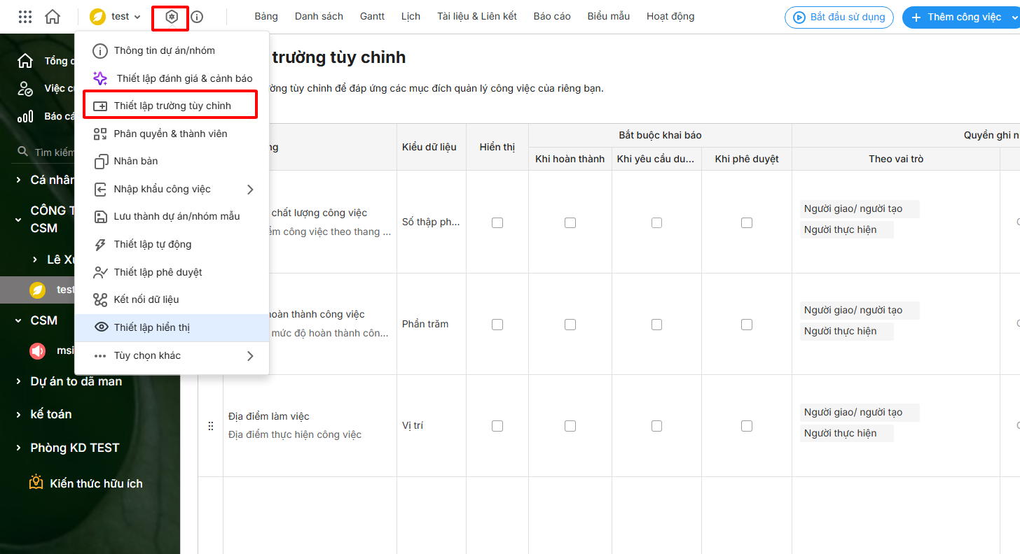 Lưu ý: Những thành viên có quyền truy cập và chỉnh sửa thông tin tại Thiết lập thông tin dự án thì mới hiển thị chức năng Trường tùy chỉnh.