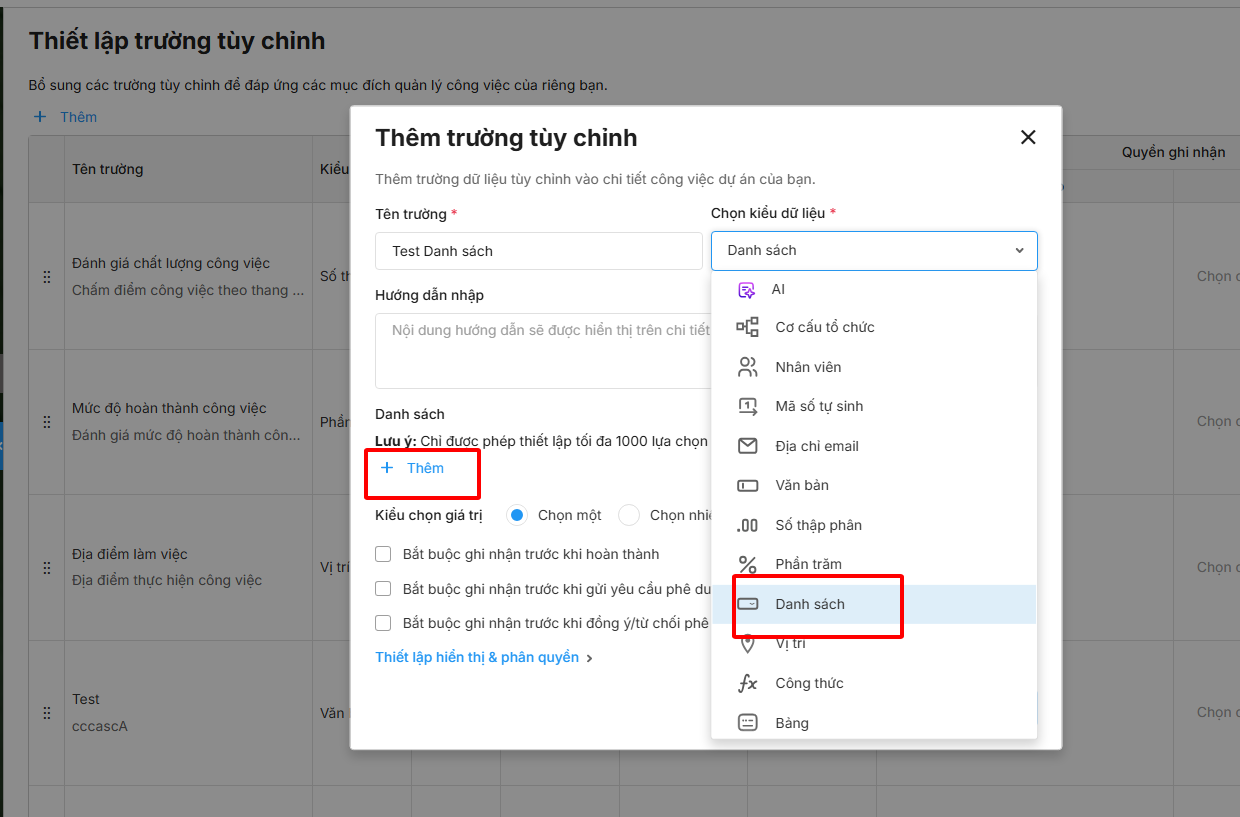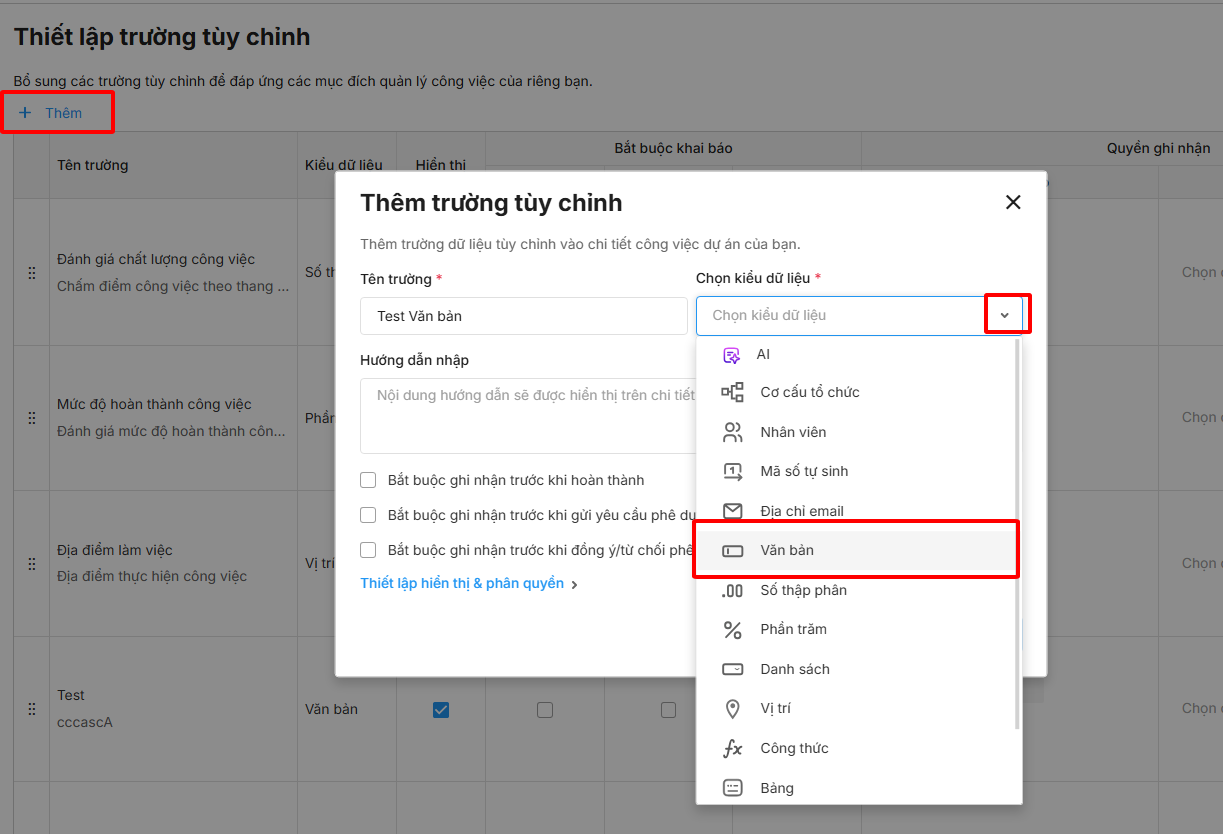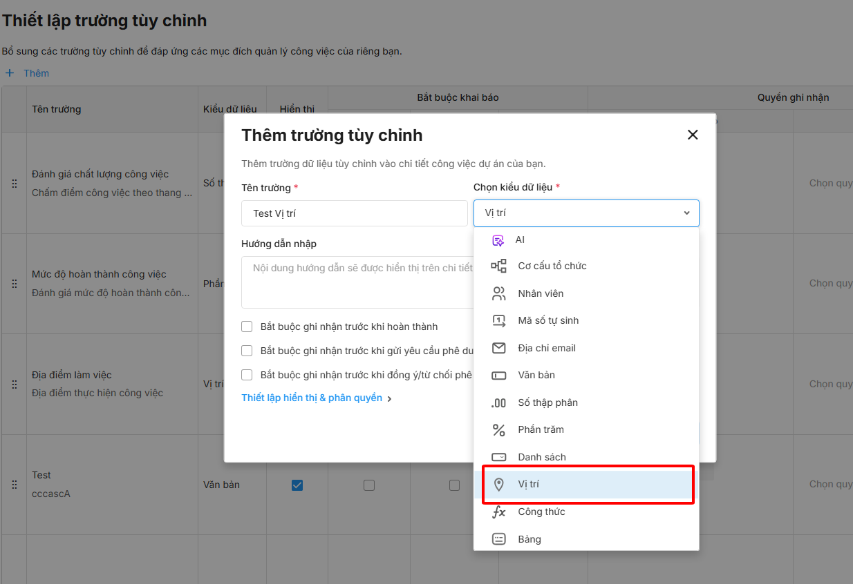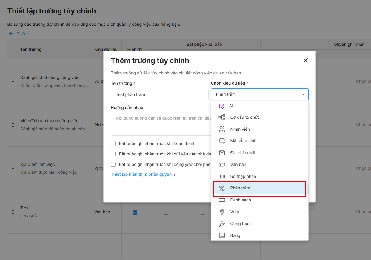 - Các loại trường tuỳ chỉnh: văn bản, số thập phân, phần trăm, danh sách, vị trí, công thức