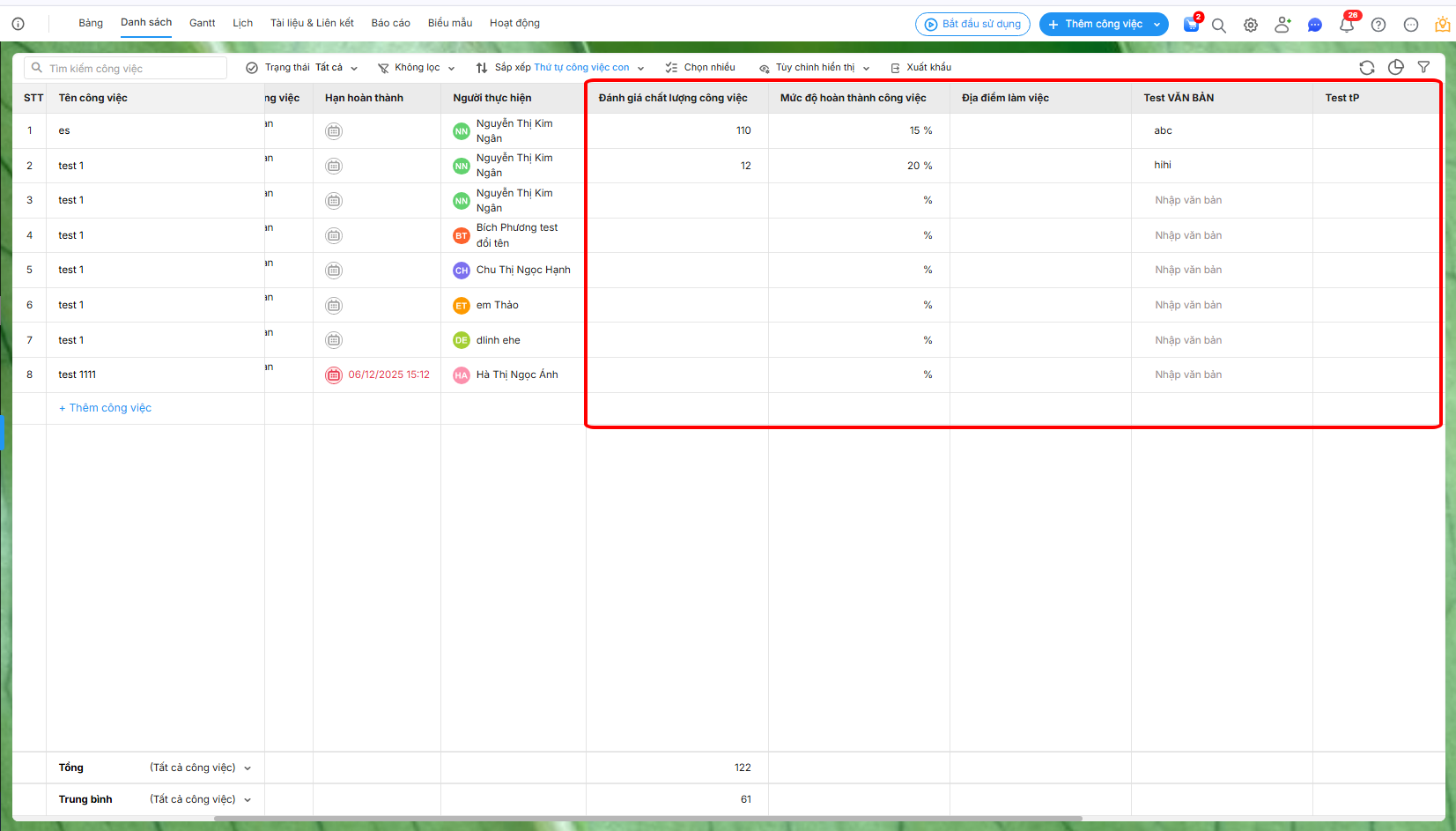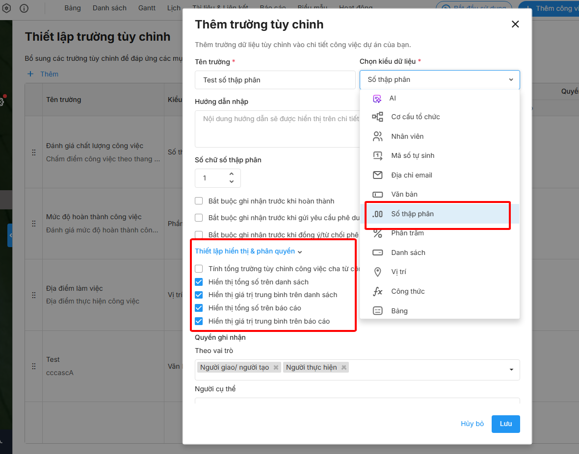 Chương trình hỗ trợ tính tổng và giá trị trung bình của trường tuỳ chỉnh dữ liệu số thập phân, có thể thiết lập hiển thị những giá trị này trên giao diện dự án dạng danh sách và trên báo cáo tạo mới.