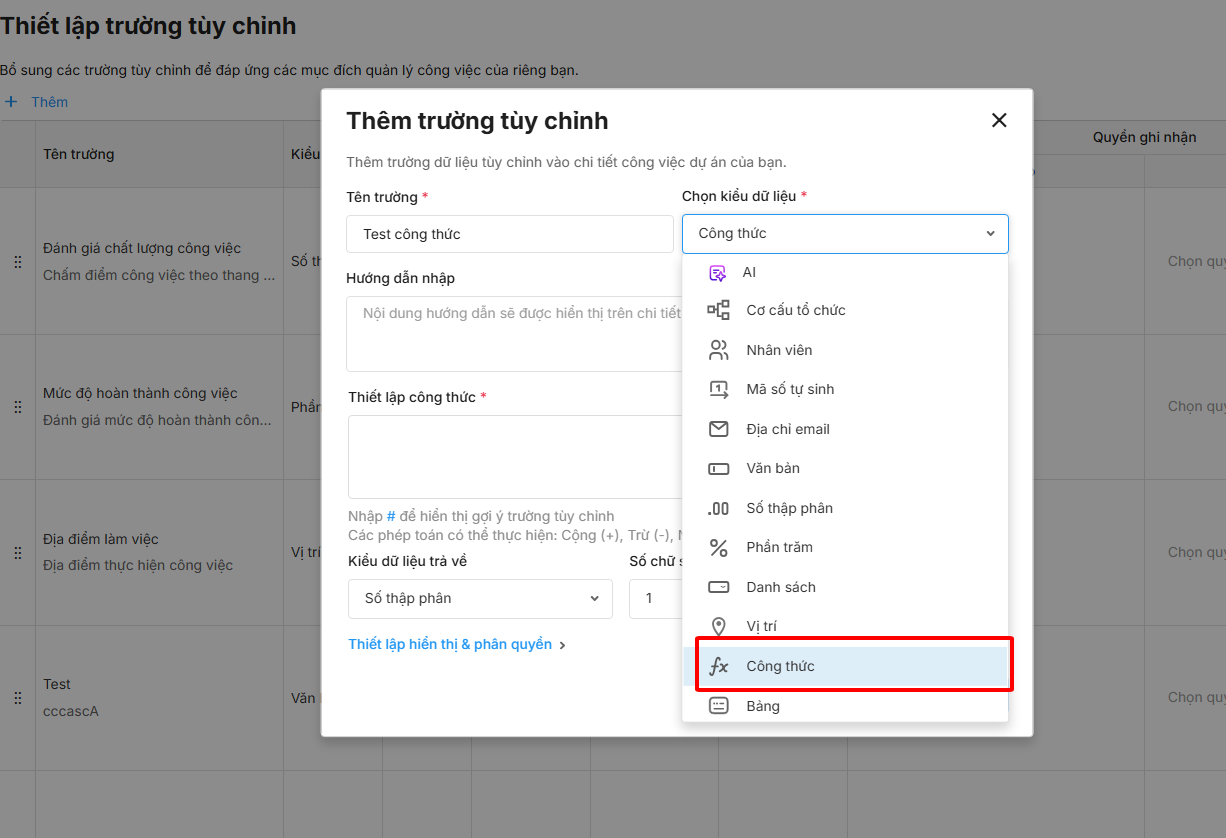 Vui lòng xem hướng dẫn chi tiết Thiết lập trường tuỳ chỉnh kiểu dữ liệu công thức tại đây.