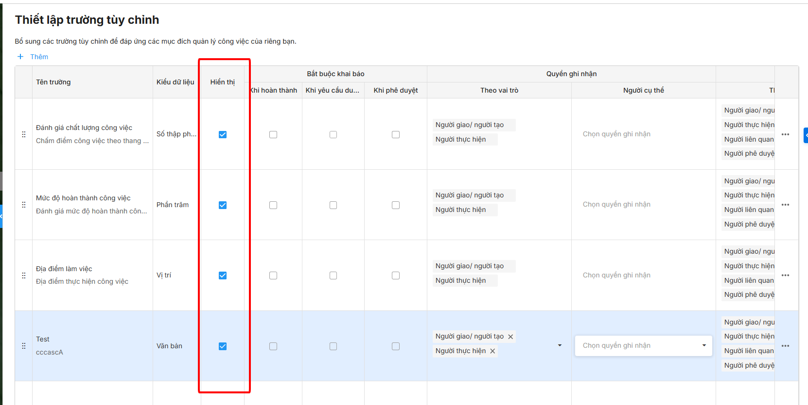 Bước 2: Chương trình mặc định một số trường tùy chỉnh, có thể chỉnh sửa, tích chọn hiển thị để áp dụng luôn vào dự án hoặc thêm trường mới bằng cách nhấn vào nút + Thêm