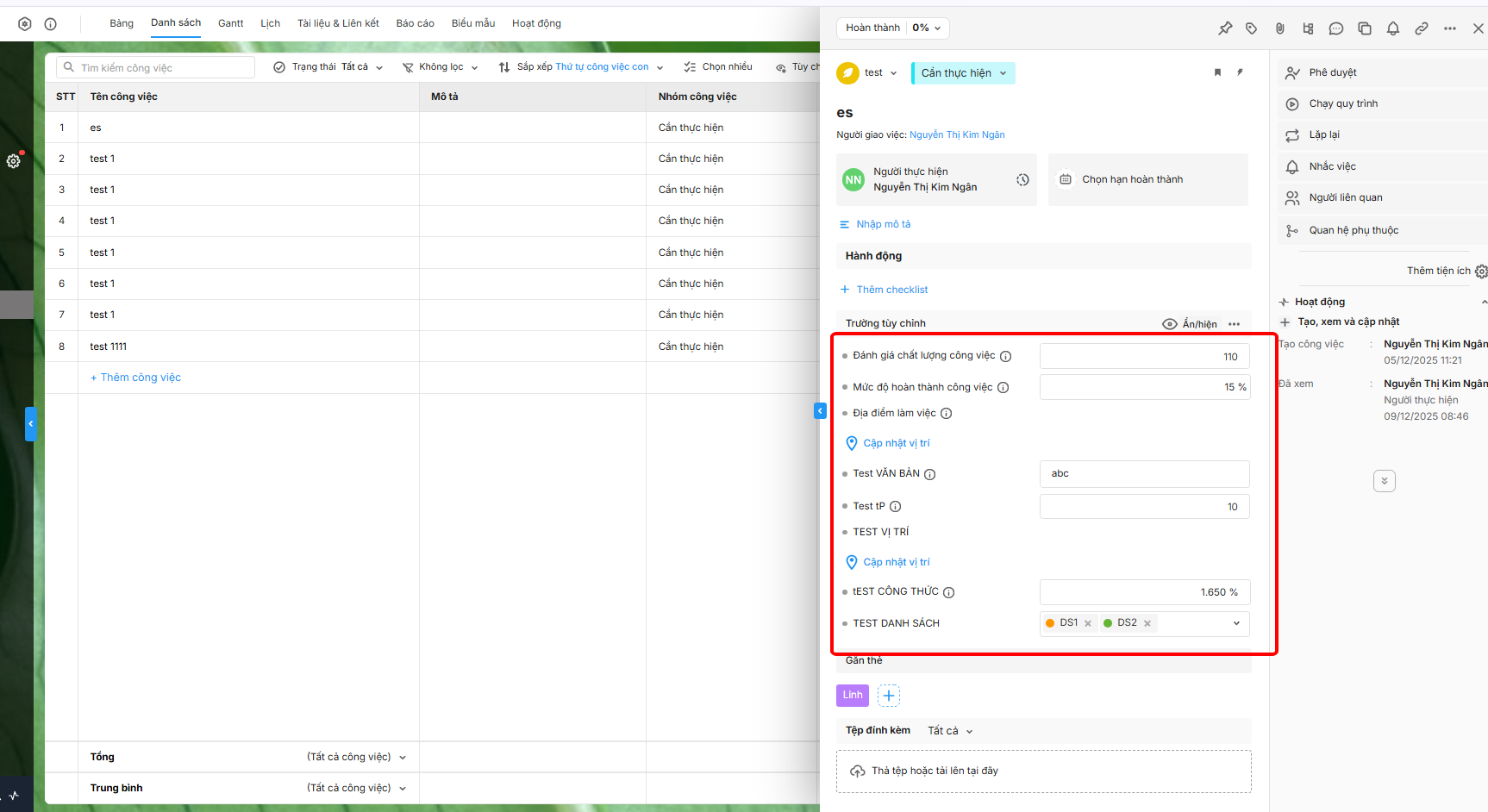 Mở danh sách công việc, kích chuột vào công việc để mở giao diện nhập thông tin trường tùy chỉnh