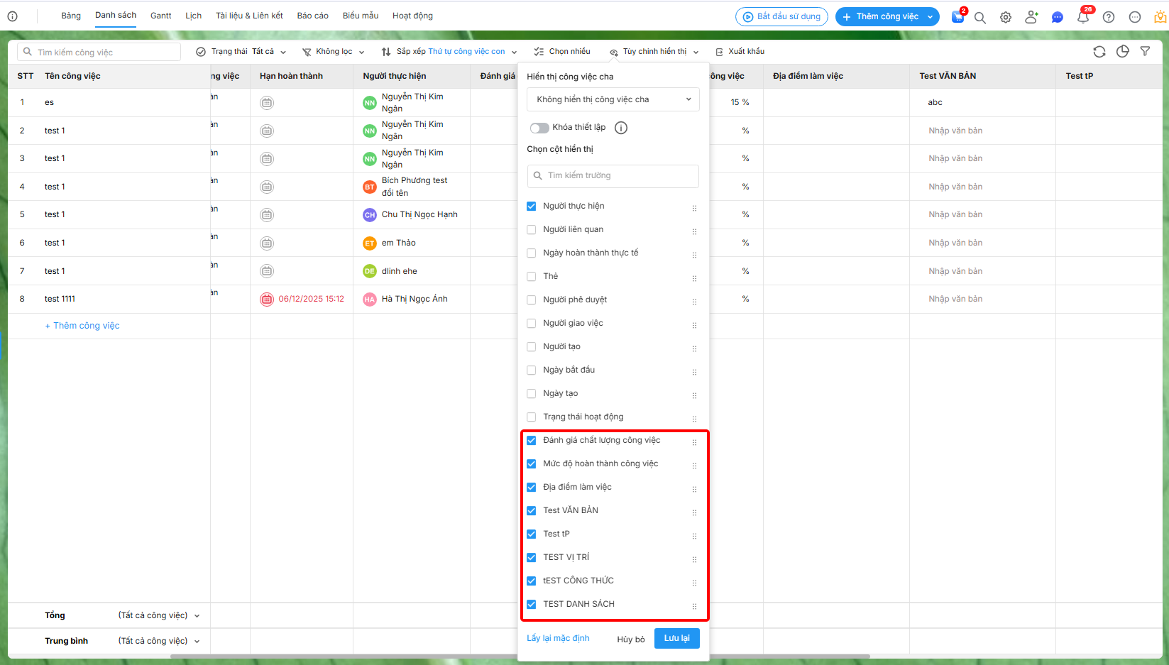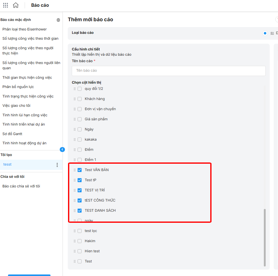 Sau khi thêm trường tuỳ chỉnh thiết lập hiển thị để sử dụng trường trên chi tiết công việc, giao diện danh sách dự án và báo cáo tạo mới.