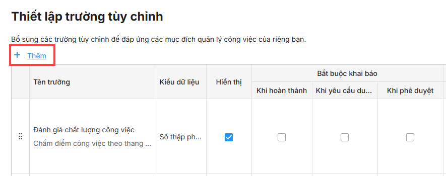 - Vào mục Thiết lập trường tuỳ chỉnh của phần quản lý Công việc.
